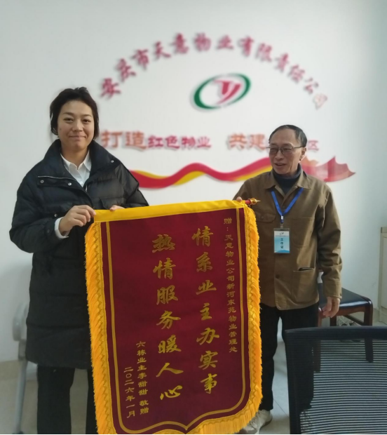 這份超出預(yù)期的貼心服務(wù)讓6#1703室業(yè)主深受感動(dòng),她特意購(gòu)買香煙致謝卻被湯主任婉拒,“為業(yè)主排憂解難是我們的本職工作”的真誠(chéng)回應(yīng),更讓業(yè)主倍感溫暖。最終,6#1703室業(yè)主送上一面錦旗,以表對(duì)天意物業(yè)盡職盡責(zé)、熱心服務(wù)的由衷認(rèn)可。